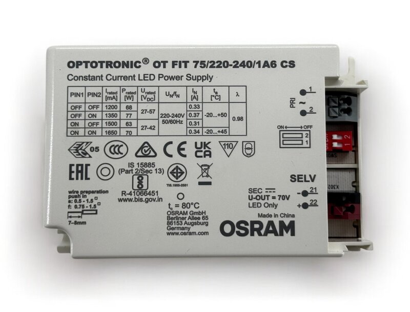 -Marca: Osram -Modello: OT FIT 75/220-240/1A6 CS -Vari modelli di wattagio 75 -Tensione d'ingresso 230 volt -Tensione in uscita da 27 a 57 volt -Corrente da 1.200 a 1.650 Amp - Non dimmerabile -Protezione IP20 -Dimensioni: Lung. 10,3cm, Alt 2,9cm, Larg. 6,7cm
